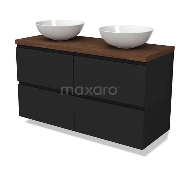 Modulo Plato Badmöbel mit Aufsatzwaschbecken | 120 cm Matt Schwarz Grifflos front Walnuss blatt 4 Schubladen