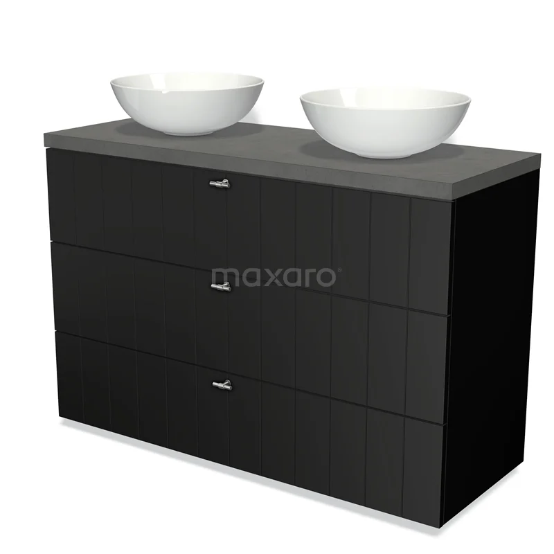 Modulo Plato Badmöbel mit Aufsatzwaschbecken | 120 cm Matt Schwarz Lamelle front Dunkelgrauer Beton blatt 3 Schubladen