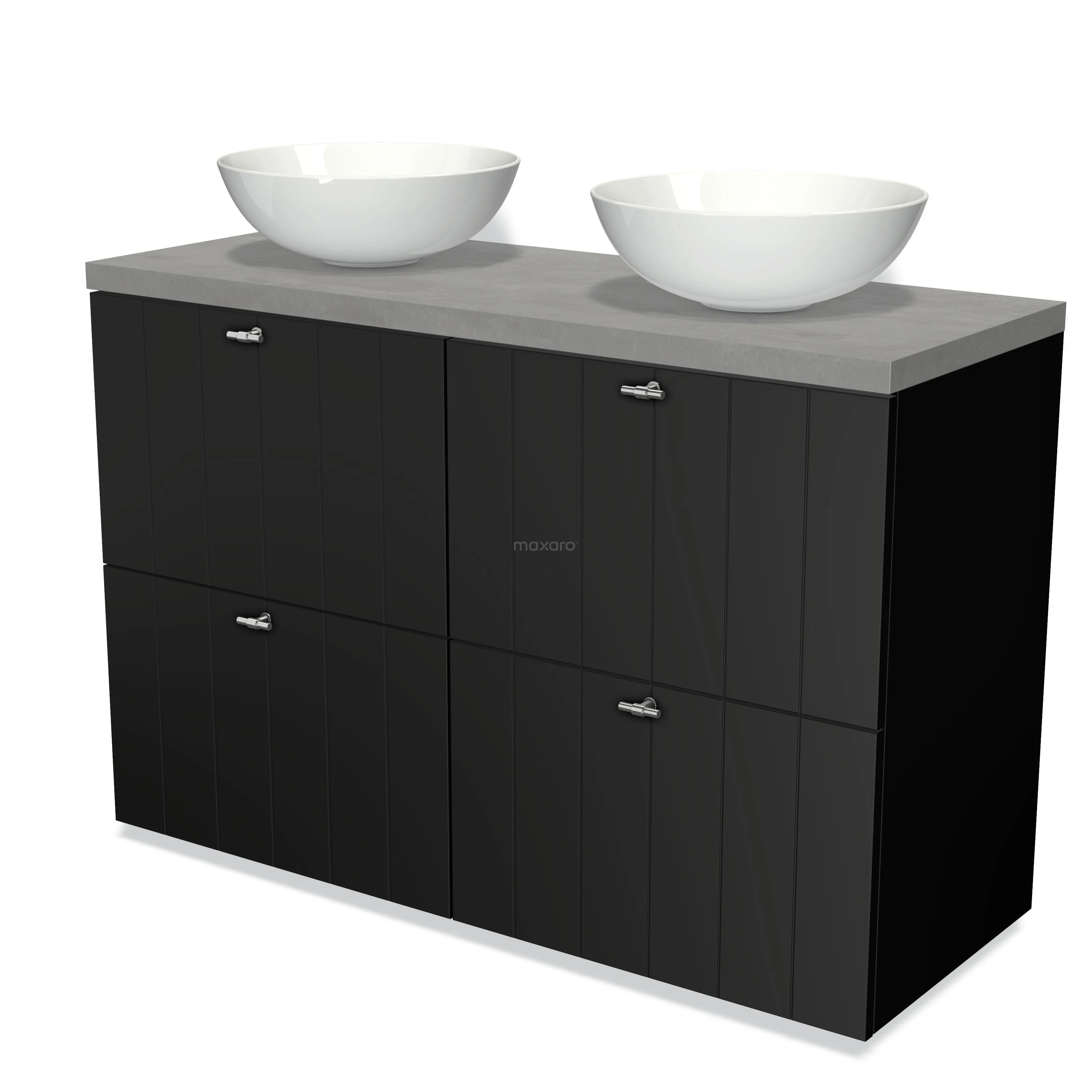 Modulo Plato Badmöbel mit Aufsatzwaschbecken | 120 cm Matt Schwarz Lamelle front Hellgrauer Beton blatt 4 hohe Schubladen