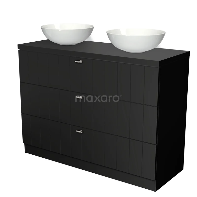 Modulo Plato Badmöbel mit Aufsatzwaschbecken | 120 cm Matt Schwarz Lamelle front Matt Schwarz blatt 3 stehende Schubladen
