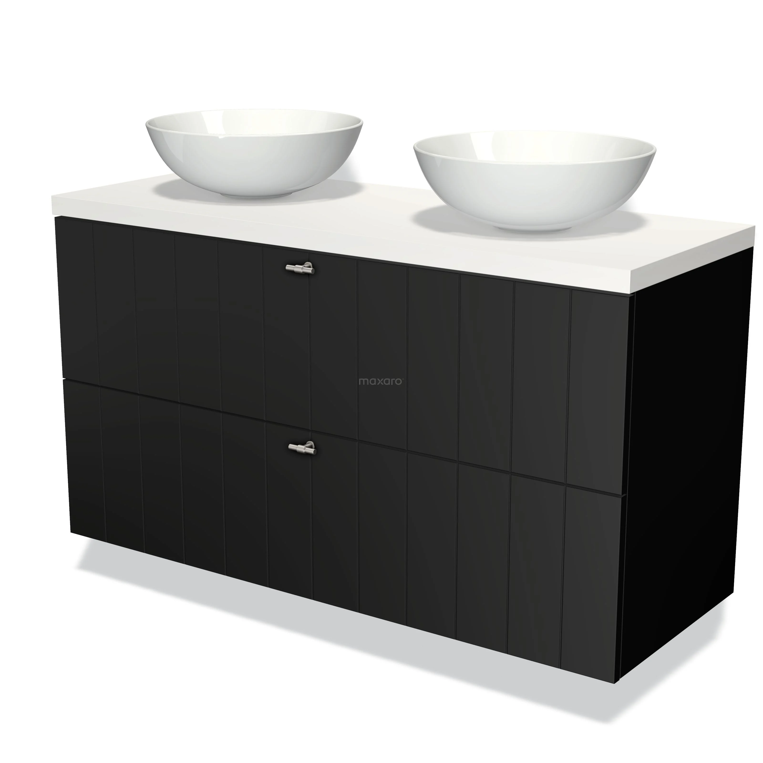 Modulo Plato Badmöbel mit Aufsatzwaschbecken | 120 cm Matt Schwarz Lamelle front Matt Weiß blatt 2 übereinanderliegende Schubladen