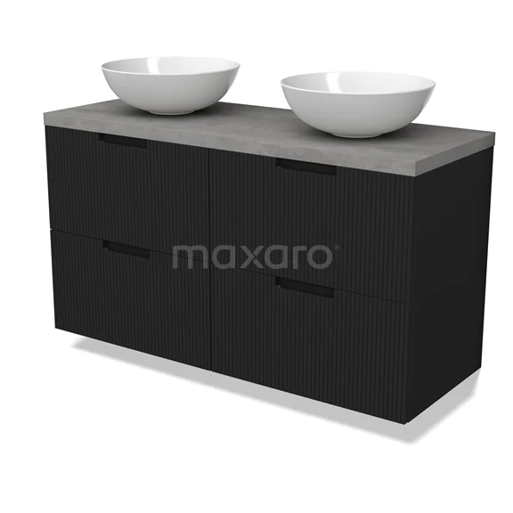 Modulo Plato Badmöbel mit Aufsatzwaschbecken | 120 cm Matt Schwarz Linie front Hellgrauer Beton blatt 4 Schubladen