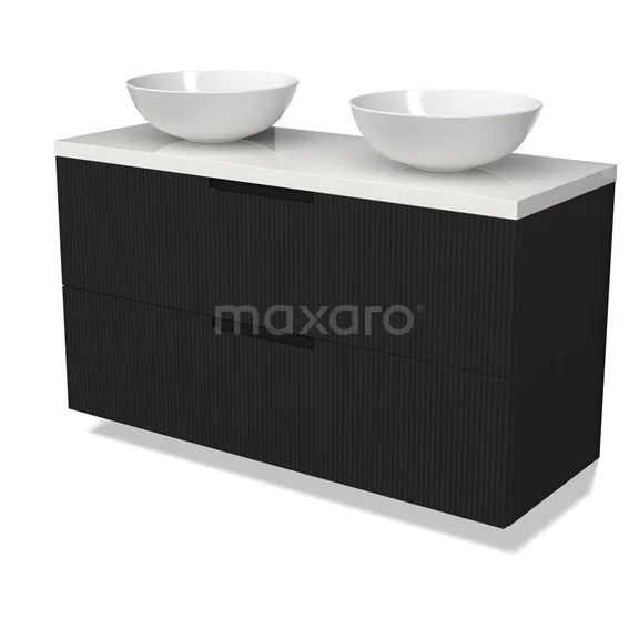Modulo Plato Badmöbel mit Aufsatzwaschbecken | 120 cm Matt Schwarz Linie front Hochglanz Weiß blatt 2 übereinanderliegende Schubladen