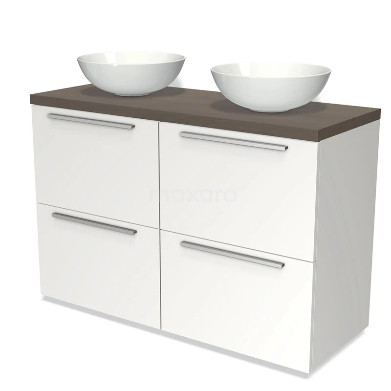 Modulo Plato Badmöbel mit Aufsatzwaschbecken | 120 cm Matt Weiß Flach front Dunkelbraune Eiche blatt 4 hohe Schubladen