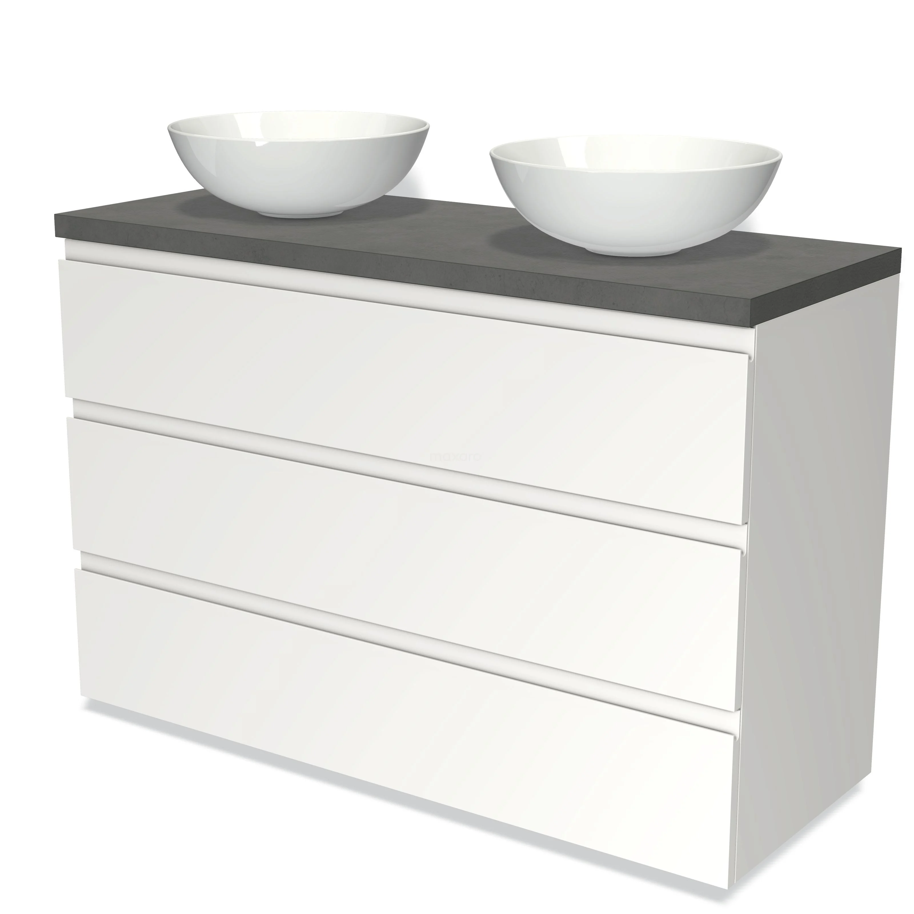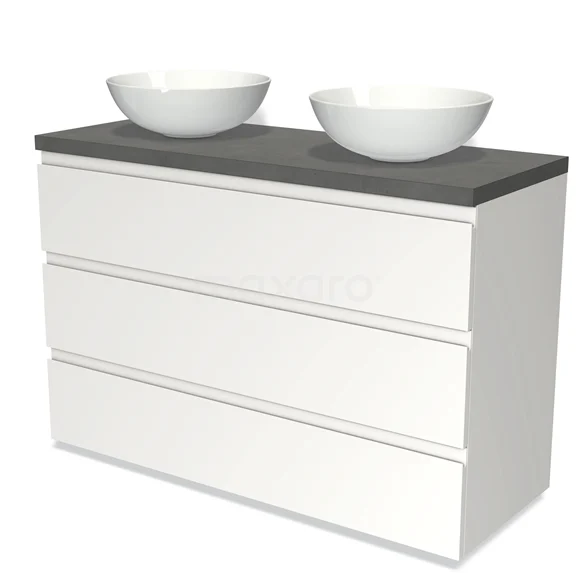 Modulo Plato Badmöbel mit Aufsatzwaschbecken | 120 cm Matt Weiß Grifflos front Dunkelgrauer Beton blatt 3 Schubladen