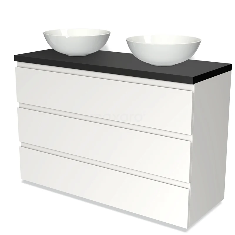 Modulo Plato Badmöbel mit Aufsatzwaschbecken | 120 cm Matt Weiß Grifflos front Matt Schwarz blatt 3 Schubladen