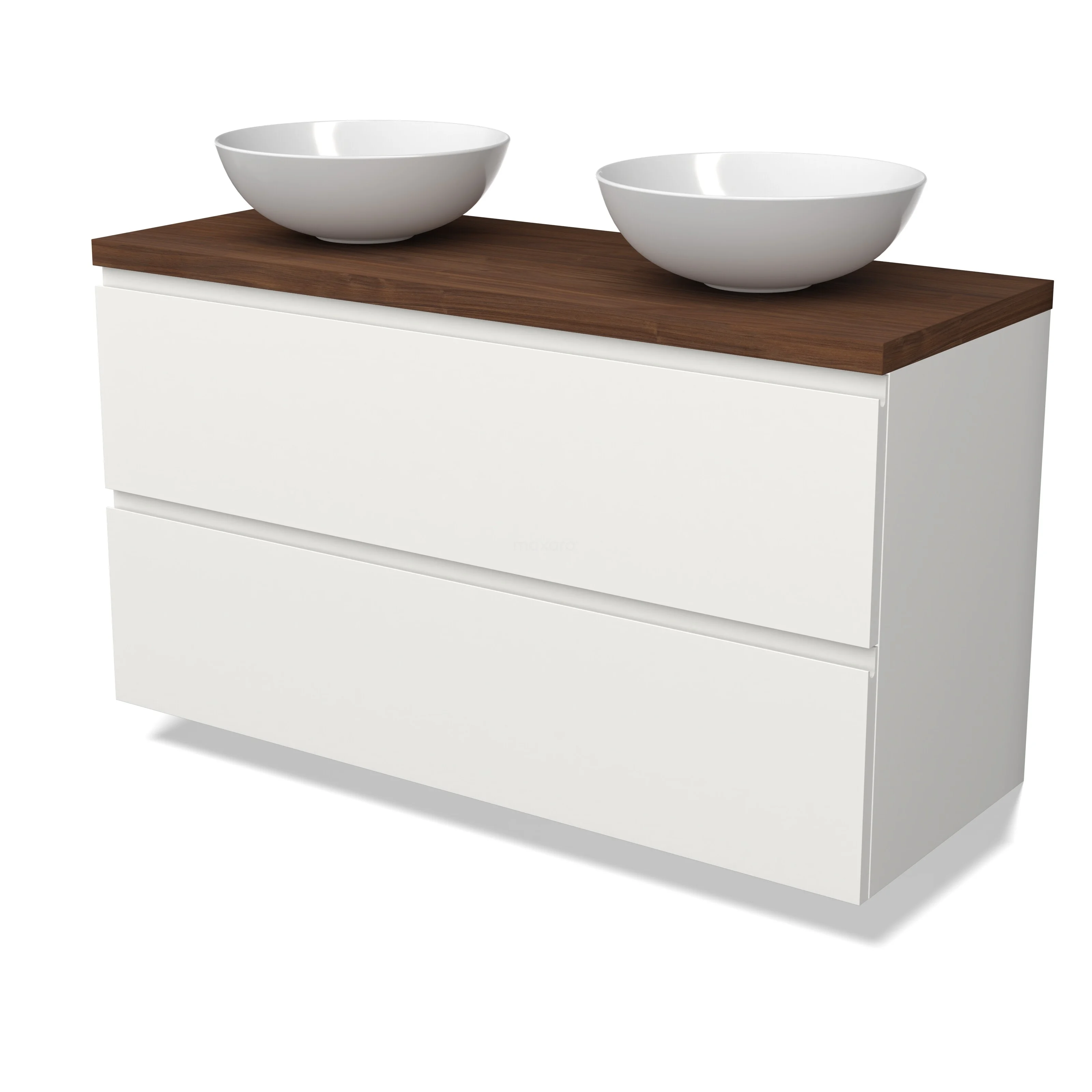Modulo Plato Badmöbel mit Aufsatzwaschbecken | 120 cm Matt Weiß Grifflos front Walnuss blatt 2 übereinanderliegende Schubladen
