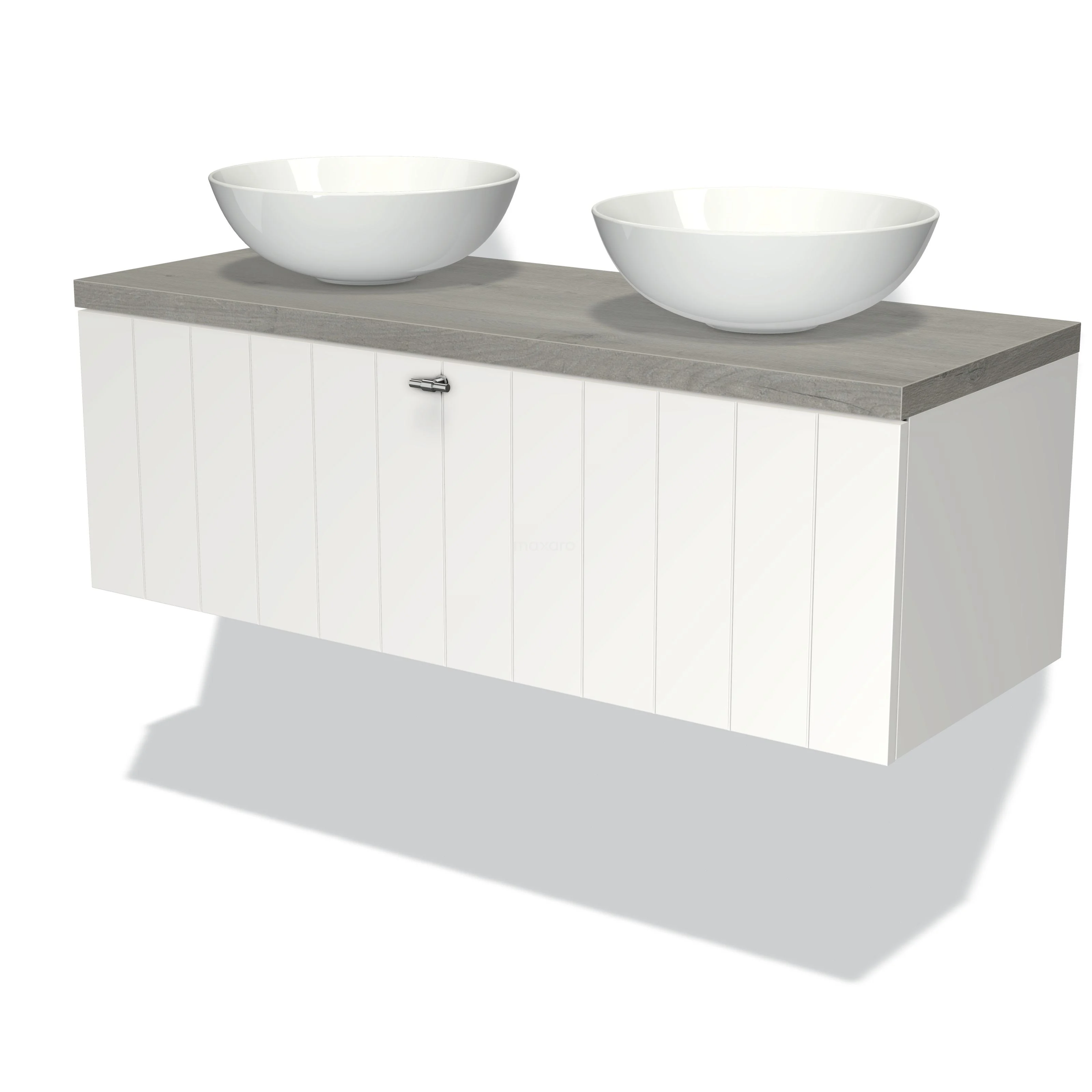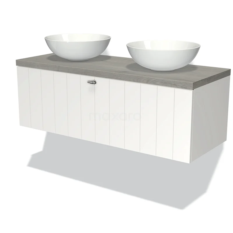 Modulo Plato Badmöbel mit Aufsatzwaschbecken | 120 cm Matt Weiß Lamelle front Graue Eiche blatt 1 Schublade