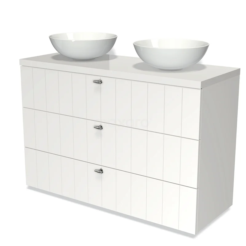 Modulo Plato Badmöbel mit Aufsatzwaschbecken | 120 cm Matt Weiß Lamelle front Hochglanz Weiß blatt 3 Schubladen
