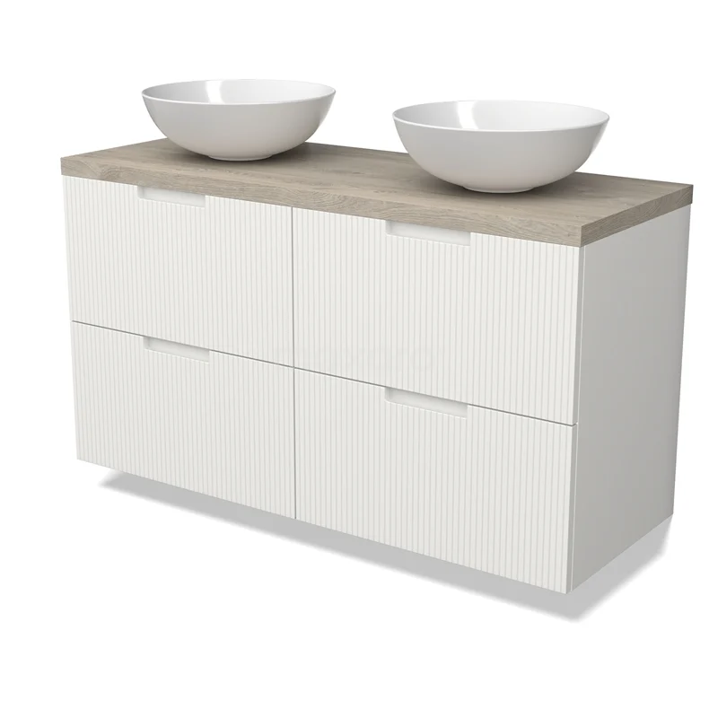 Modulo Plato Badmöbel mit Aufsatzwaschbecken | 120 cm Matt Weiß Linie front Hellgraue Eiche blatt 4 Schubladen