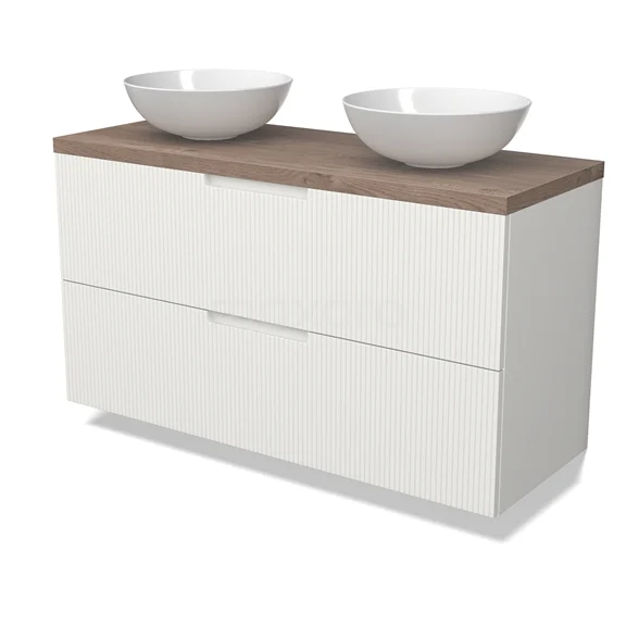 Modulo Plato Badmöbel mit Aufsatzwaschbecken | 120 cm Matt Weiß Linie front Mittelbraune Eiche blatt 2 übereinanderliegende Schubladen