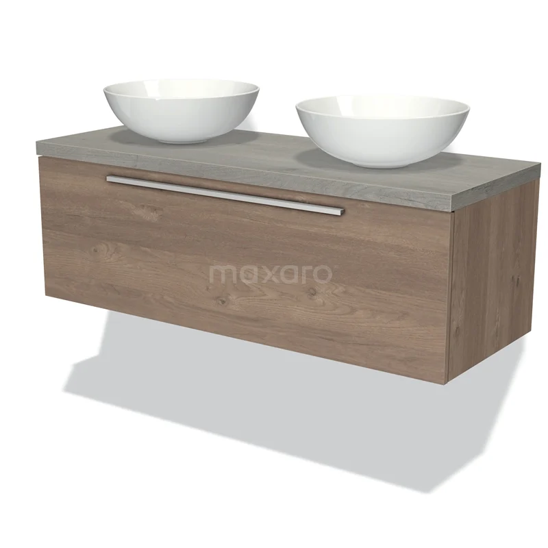 Modulo Plato Badmöbel mit Aufsatzwaschbecken | 120 cm Mittelbraune Eiche Flach front Graue Eiche blatt 1 Schublade