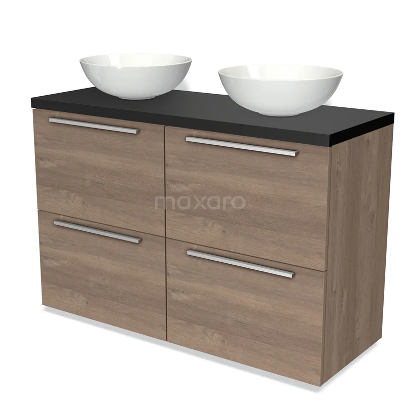 Modulo Plato Badmöbel mit Aufsatzwaschbecken | 120 cm Mittelbraune Eiche Flach front Matt Schwarz blatt 4 hohe Schubladen