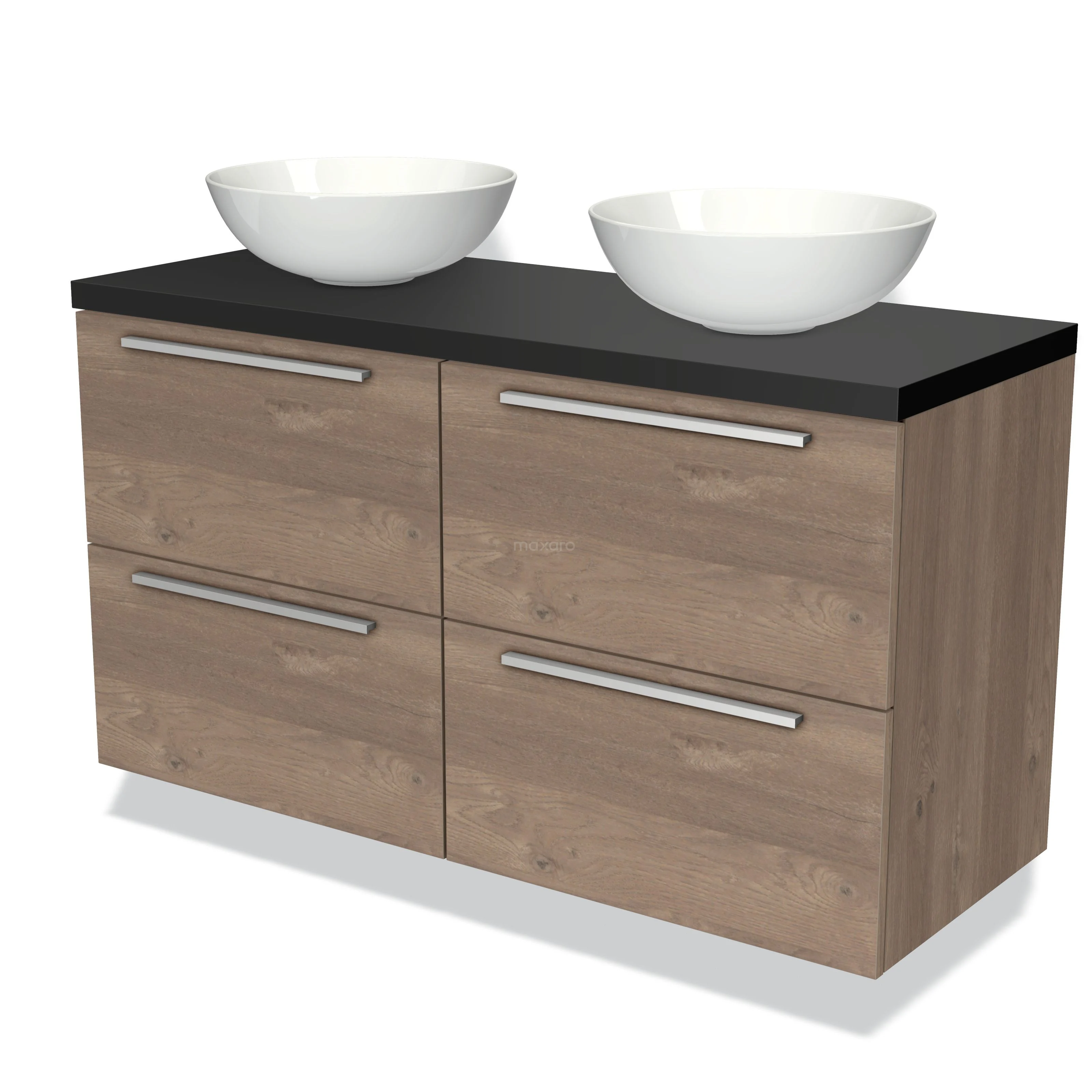 Modulo Plato Badmöbel mit Aufsatzwaschbecken | 120 cm Mittelbraune Eiche Flach front Matt Schwarz blatt 4 Schubladen