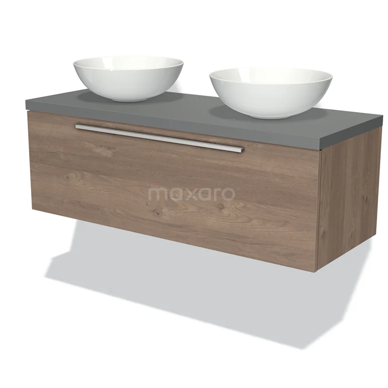 Modulo Plato Badmöbel mit Aufsatzwaschbecken | 120 cm Mittelbraune Eiche Flach front Mittelgrau blatt 1 Schublade