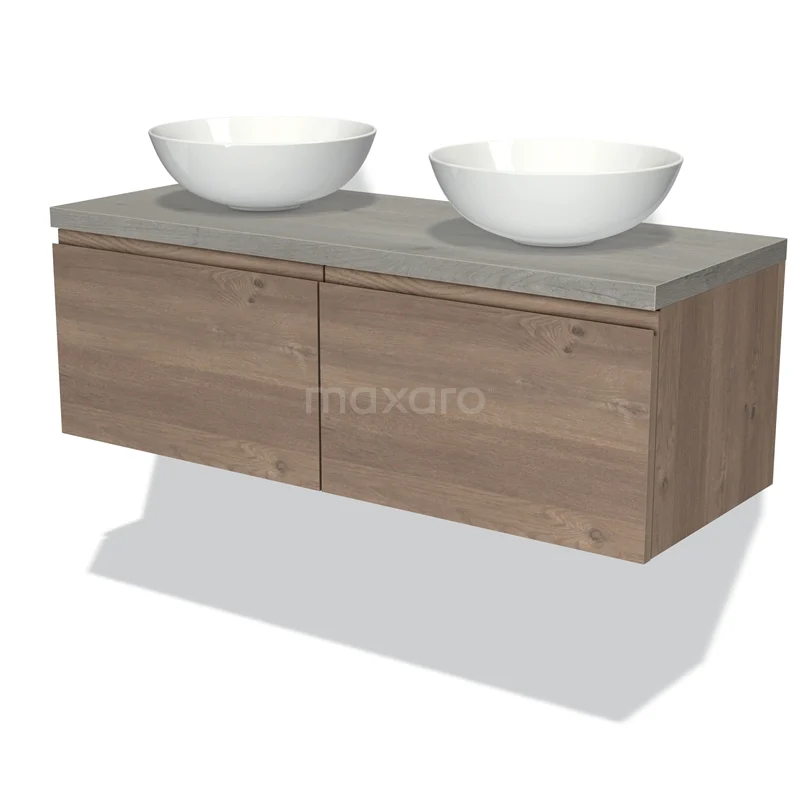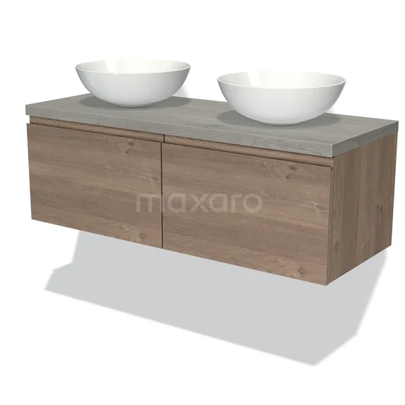 Modulo Plato Badmöbel mit Aufsatzwaschbecken | 120 cm Mittelbraune Eiche Grifflos front Graue Eiche blatt 2 nebeneinanderliegende Schubladen