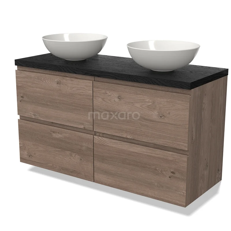 Modulo Plato Badmöbel mit Aufsatzwaschbecken | 120 cm Mittelbraune Eiche Grifflos front Schwarze Eiche blatt 4 Schubladen