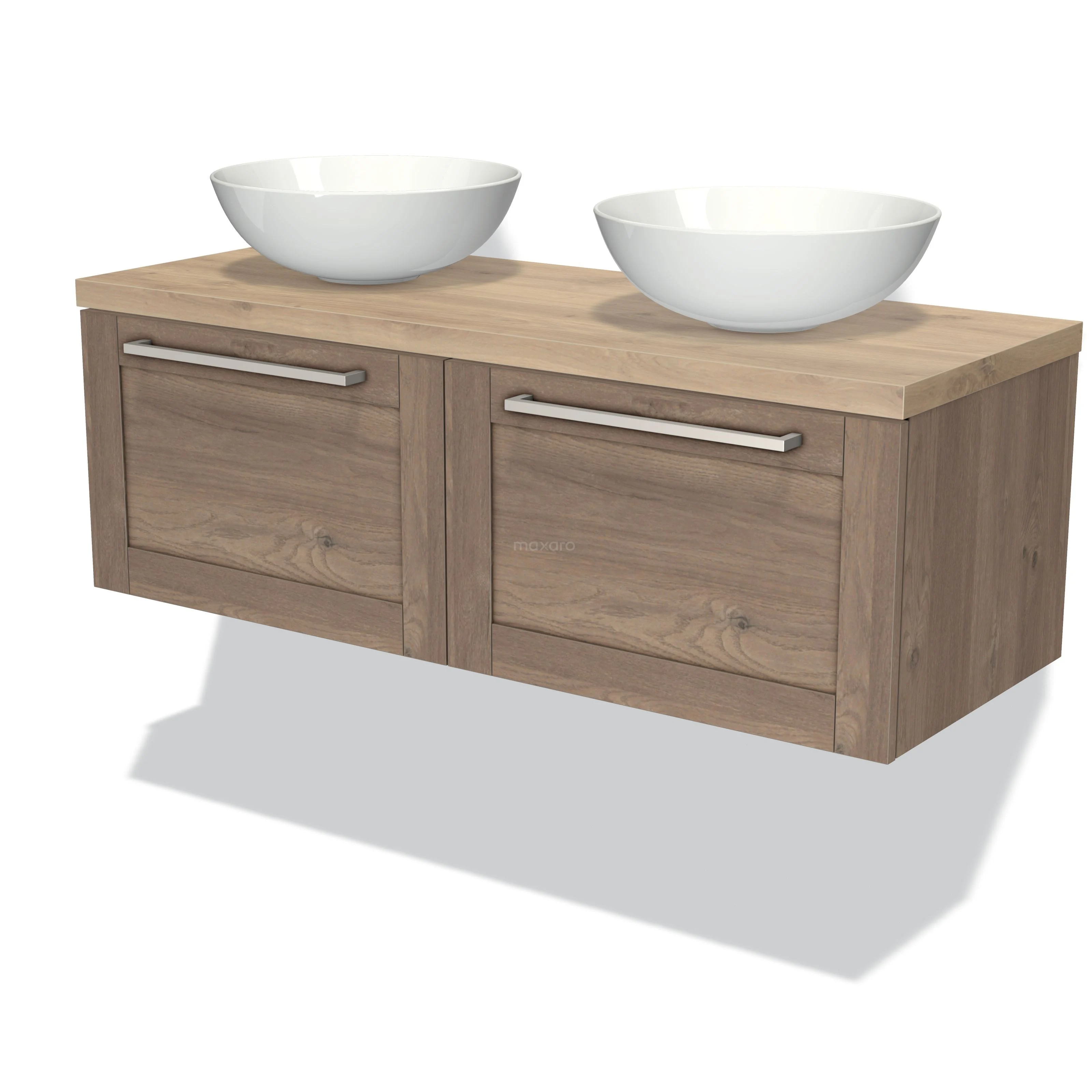 Modulo Plato Badmöbel mit Aufsatzwaschbecken | 120 cm Mittelbraune Eiche Rahmen front Hellbraune Eiche blatt 2 nebeneinanderliegende Schubladen