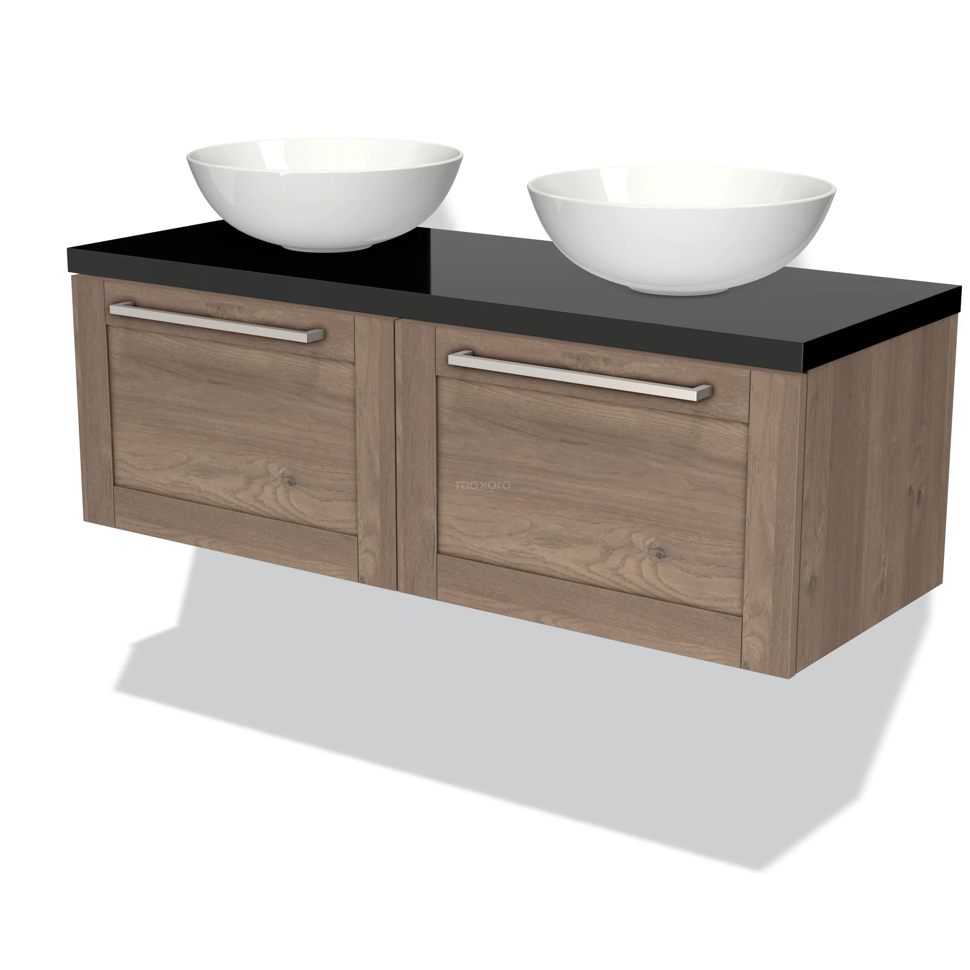 Modulo Plato Badmöbel mit Aufsatzwaschbecken | 120 cm Mittelbraune Eiche Rahmen front Hochglanz Schwarz blatt 2 nebeneinanderliegende Schubladen