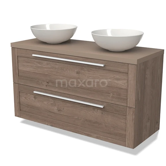 Modulo Plato Badmöbel mit Aufsatzwaschbecken | 120 cm Mittelbraune Eiche Rahmen front Taupe blatt 2 übereinanderliegende Schubladen