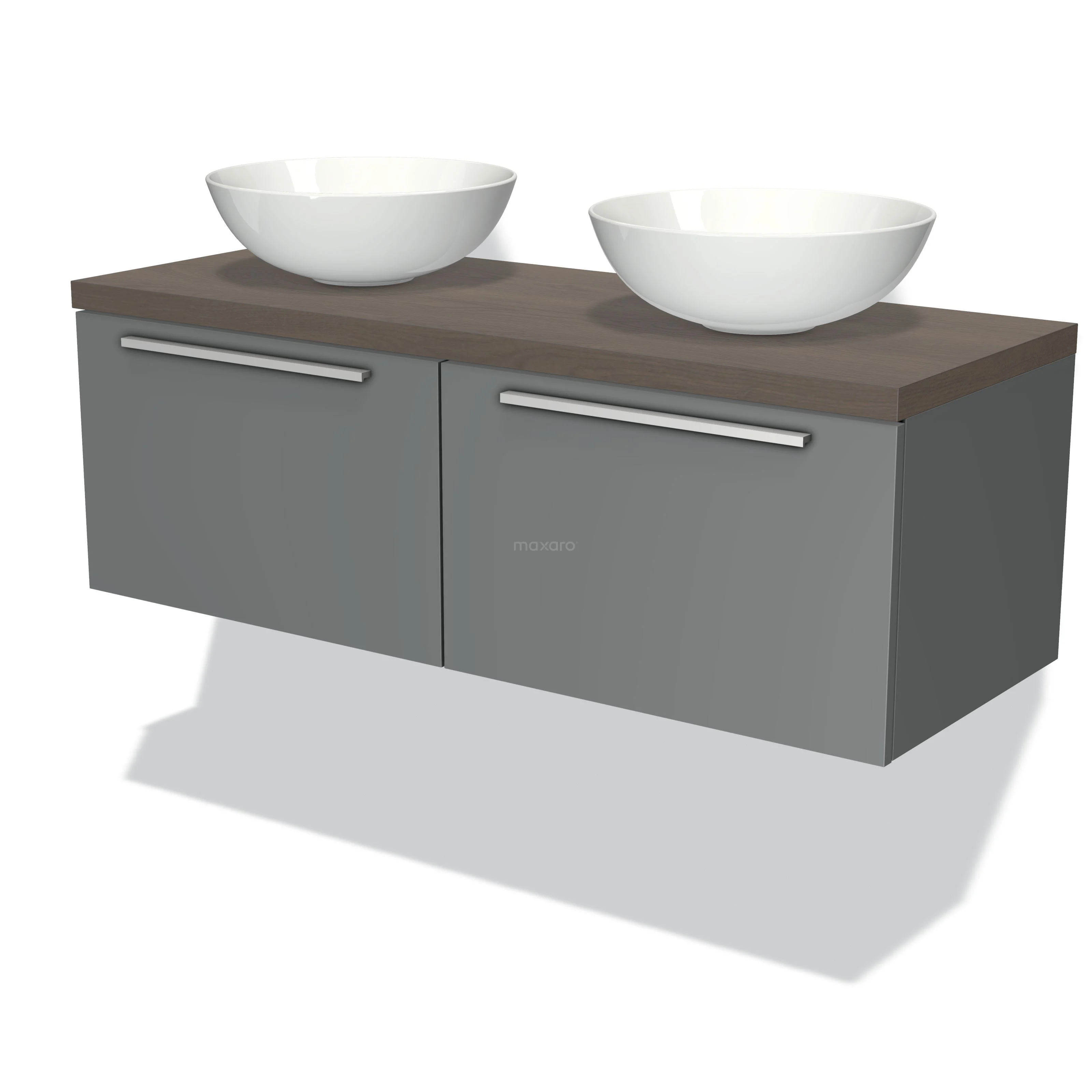 Modulo Plato Badmöbel mit Aufsatzwaschbecken | 120 cm Mittelgrau Flach front Dunkelbraune Eiche blatt 2 nebeneinanderliegende Schubladen