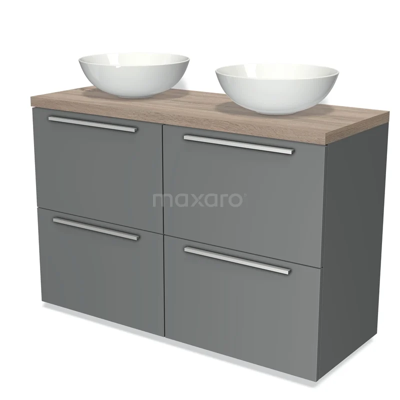 Modulo Plato Badmöbel mit Aufsatzwaschbecken | 120 cm Mittelgrau Flach front Eiche blatt 4 hohe Schubladen