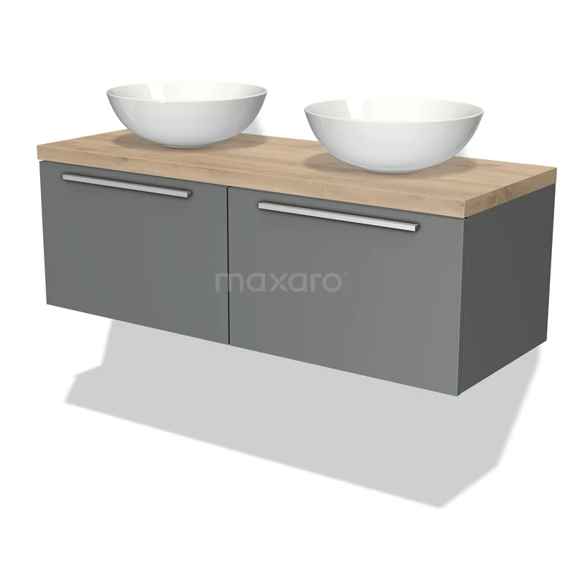 Modulo Plato Badmöbel mit Aufsatzwaschbecken | 120 cm Mittelgrau Flach front Hellbraune Eiche blatt 2 nebeneinanderliegende Schubladen