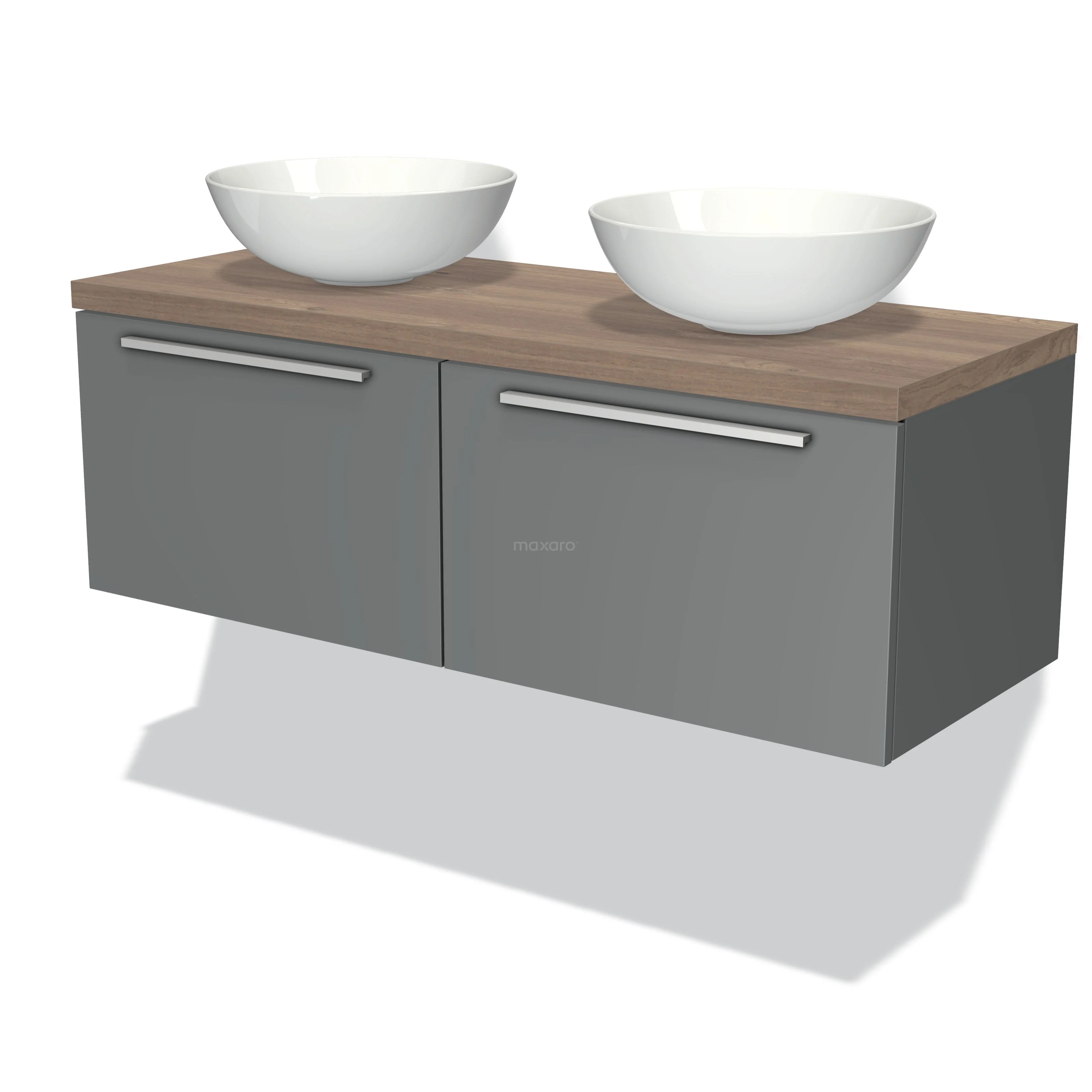 Modulo Plato Badmöbel mit Aufsatzwaschbecken | 120 cm Mittelgrau Flach front Mittelbraune Eiche blatt 2 nebeneinanderliegende Schubladen