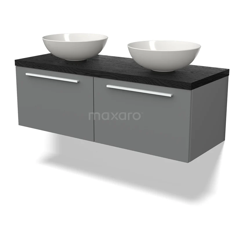 Modulo Plato Badmöbel mit Aufsatzwaschbecken | 120 cm Mittelgrau Flach front Schwarze Eiche blatt 2 nebeneinanderliegende Schubladen