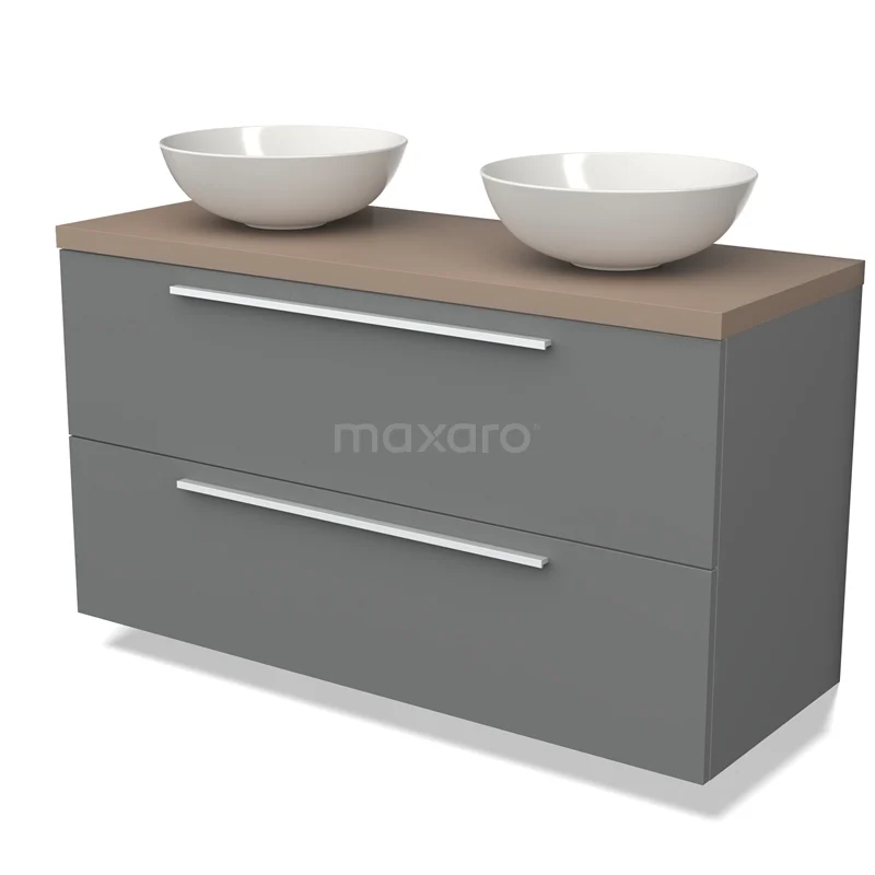 Modulo Plato Badmöbel mit Aufsatzwaschbecken | 120 cm Mittelgrau Flach front Taupe blatt 2 übereinanderliegende Schubladen