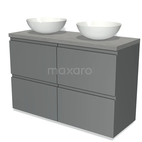 Modulo Plato Badmöbel mit Aufsatzwaschbecken | 120 cm Mittelgrau Grifflos front Hellgrauer Beton blatt 4 hohe Schubladen