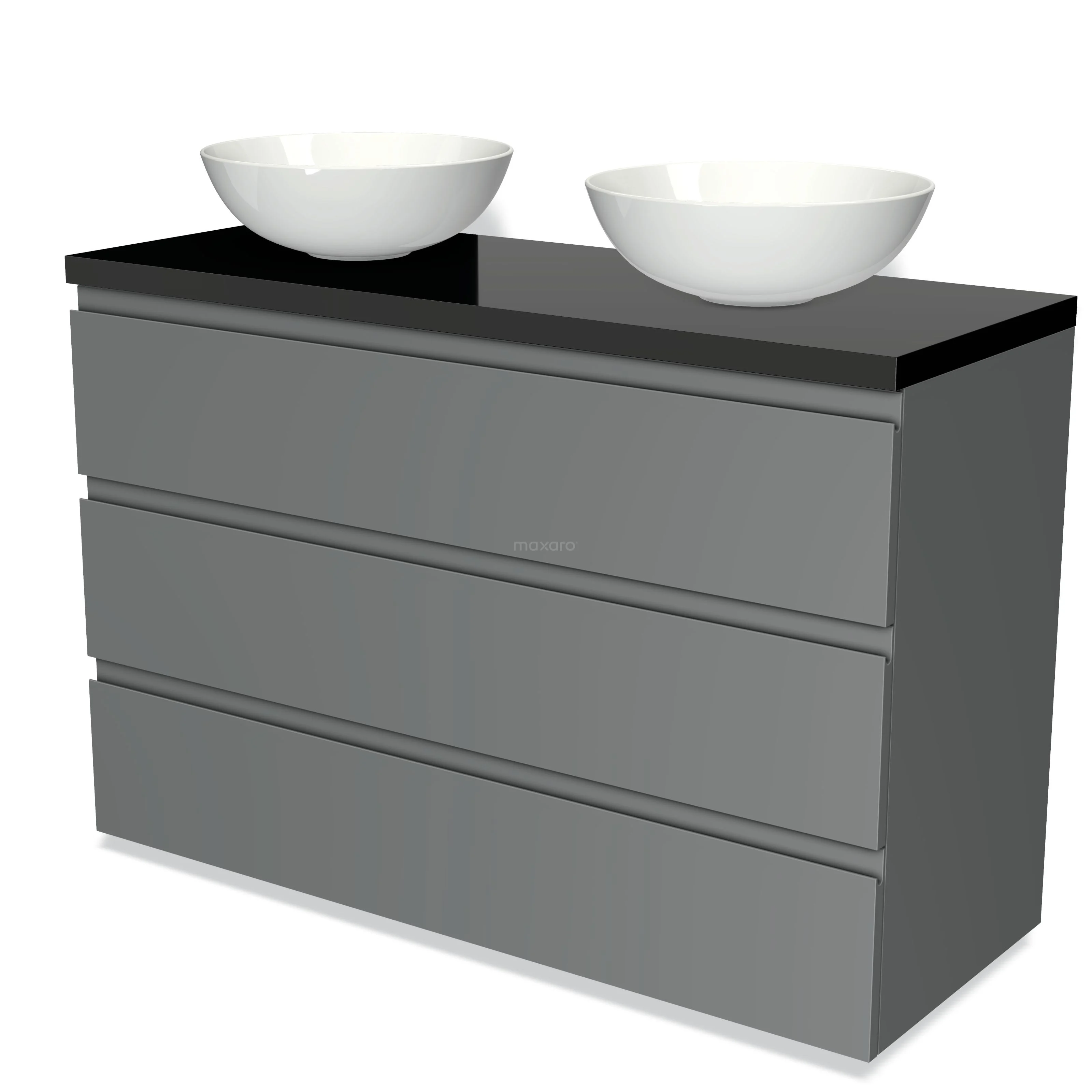 Modulo Plato Badmöbel mit Aufsatzwaschbecken | 120 cm Mittelgrau Grifflos front Hochglanz Schwarz blatt 3 Schubladen