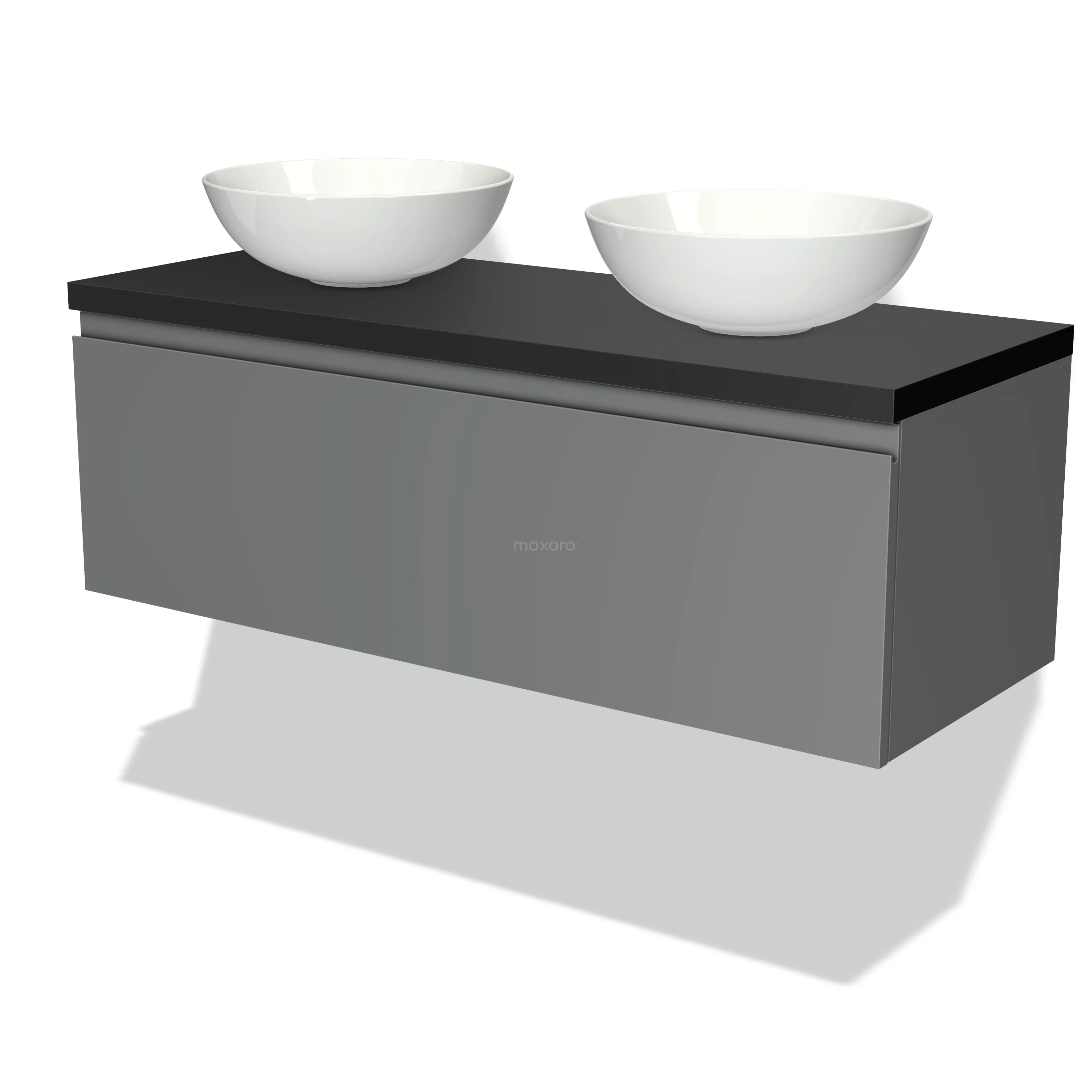 Modulo Plato Badmöbel mit Aufsatzwaschbecken | 120 cm Mittelgrau Grifflos front Matt Schwarz blatt 1 Schublade