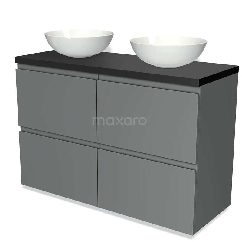 Modulo Plato Badmöbel mit Aufsatzwaschbecken | 120 cm Mittelgrau Grifflos front Matt Schwarz blatt 4 hohe Schubladen