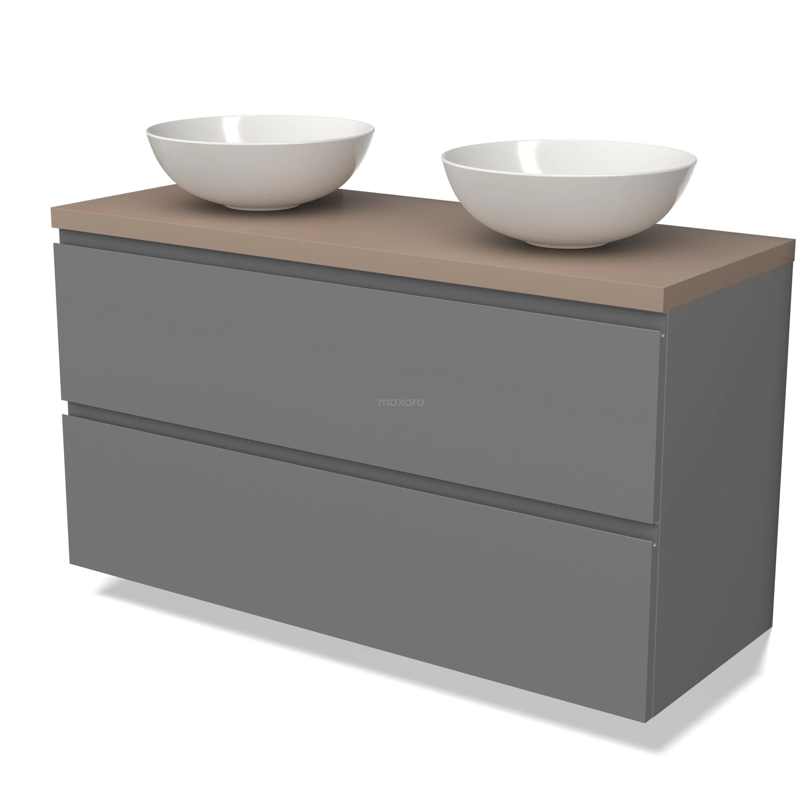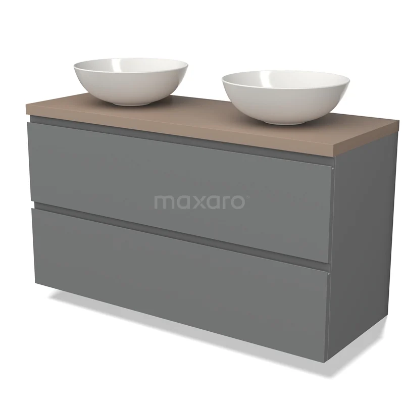 Modulo Plato Badmöbel mit Aufsatzwaschbecken | 120 cm Mittelgrau Grifflos front Taupe blatt 2 übereinanderliegende Schubladen
