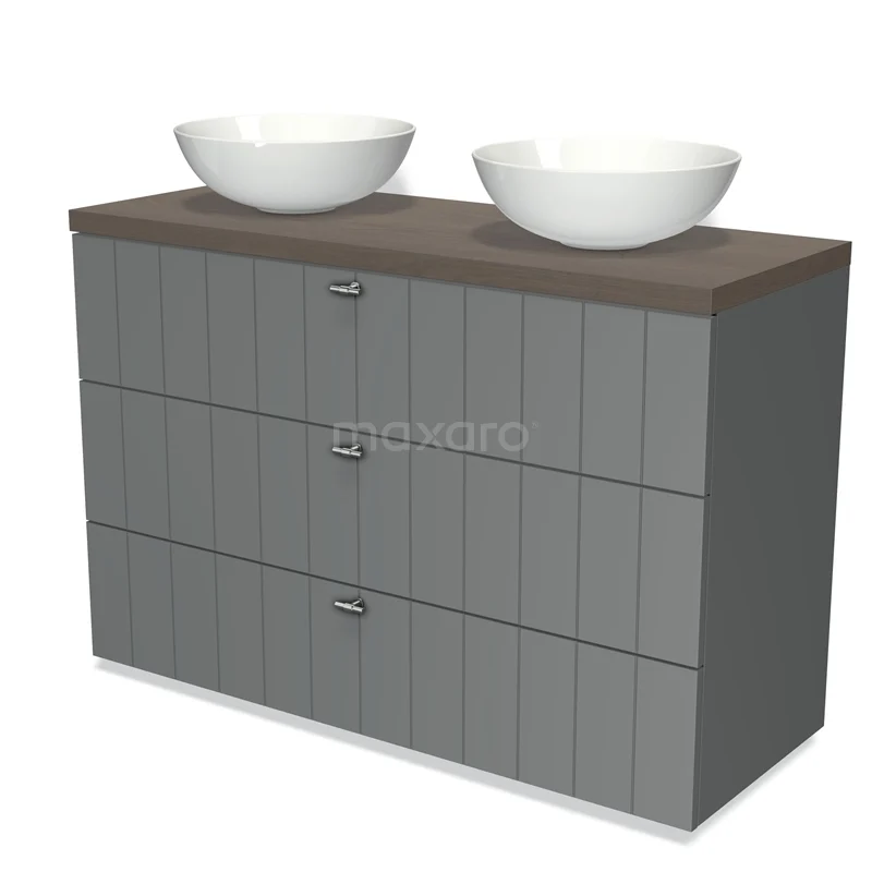 Modulo Plato Badmöbel mit Aufsatzwaschbecken | 120 cm Mittelgrau Lamelle front Dunkelbraune Eiche blatt 3 Schubladen