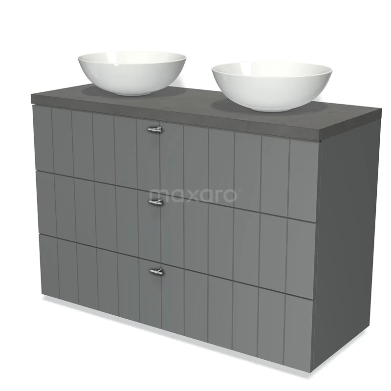 Modulo Plato Badmöbel mit Aufsatzwaschbecken | 120 cm Mittelgrau Lamelle front Dunkelgrauer Beton blatt 3 Schubladen