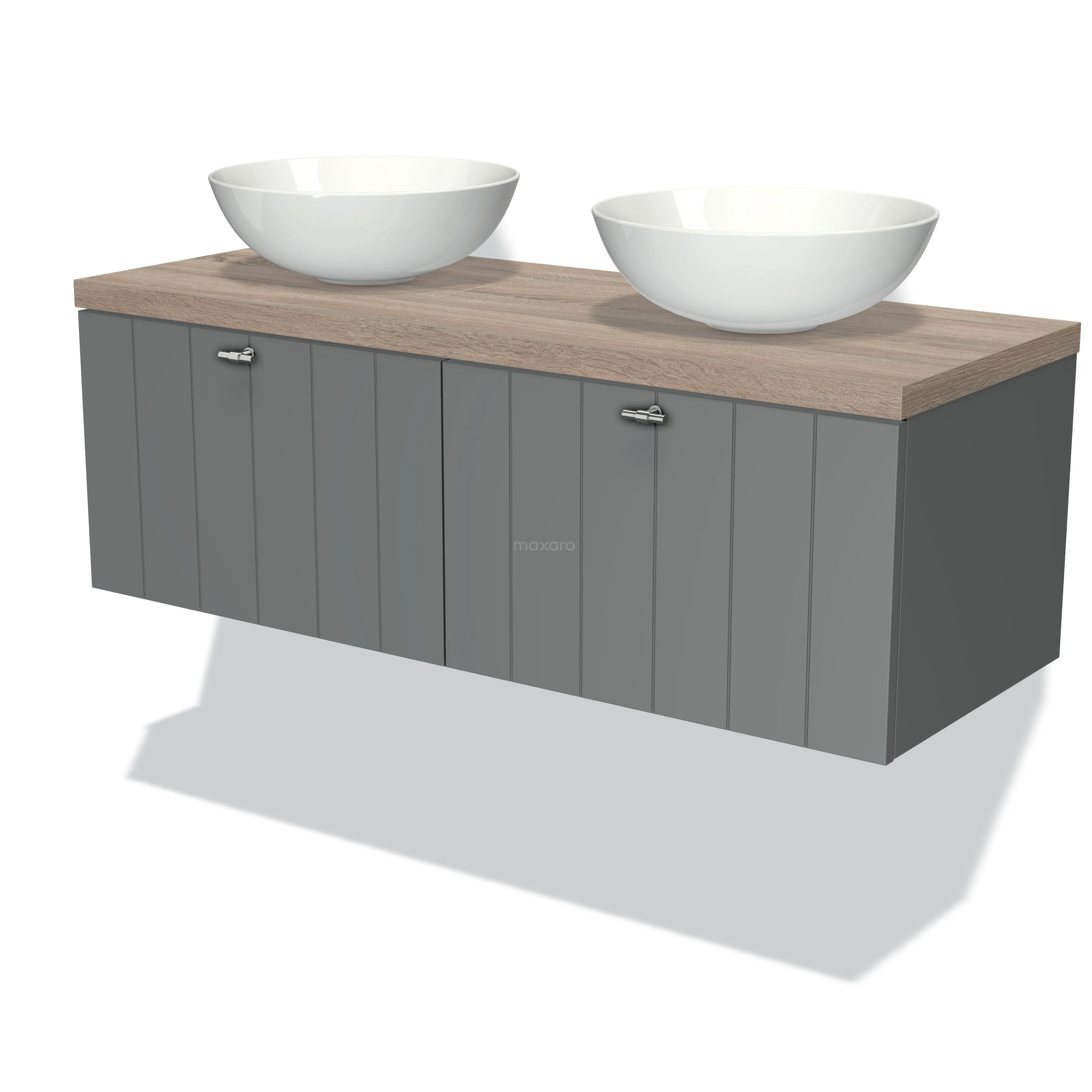 Modulo Plato Badmöbel mit Aufsatzwaschbecken | 120 cm Mittelgrau Lamelle front Eiche blatt 2 nebeneinanderliegende Schubladen