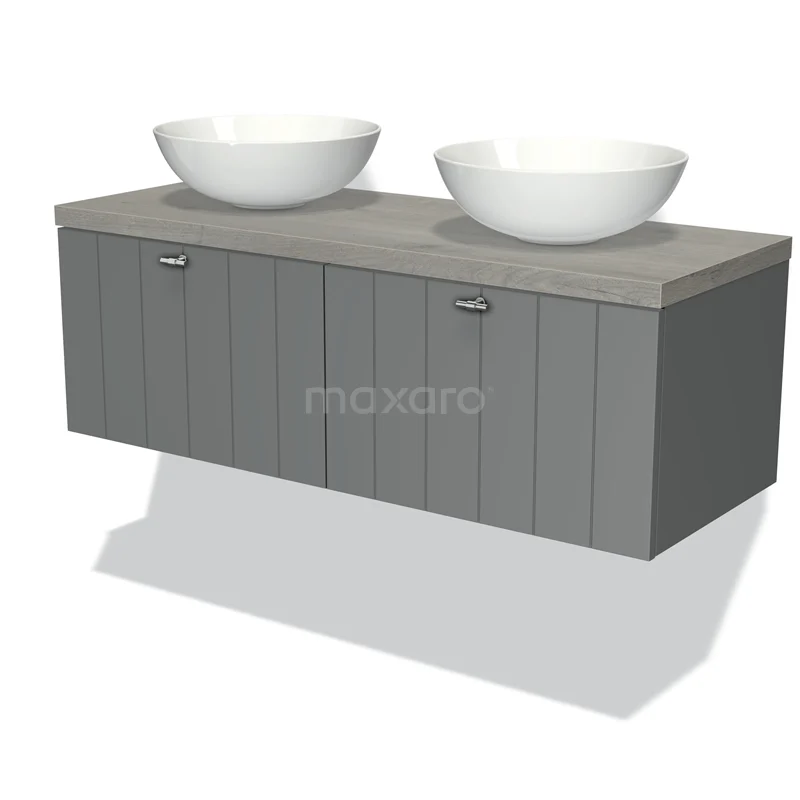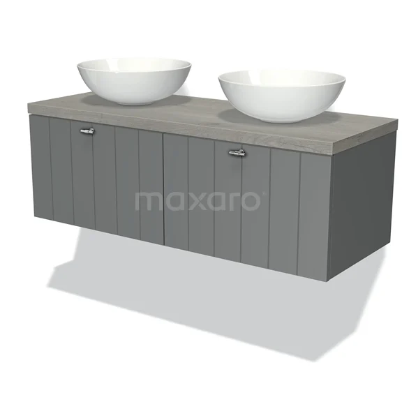 Modulo Plato Badmöbel mit Aufsatzwaschbecken | 120 cm Mittelgrau Lamelle front Graue Eiche blatt 2 nebeneinanderliegende Schubladen