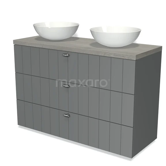 Modulo Plato Badmöbel mit Aufsatzwaschbecken | 120 cm Mittelgrau Lamelle front Graue Eiche blatt 3 Schubladen
