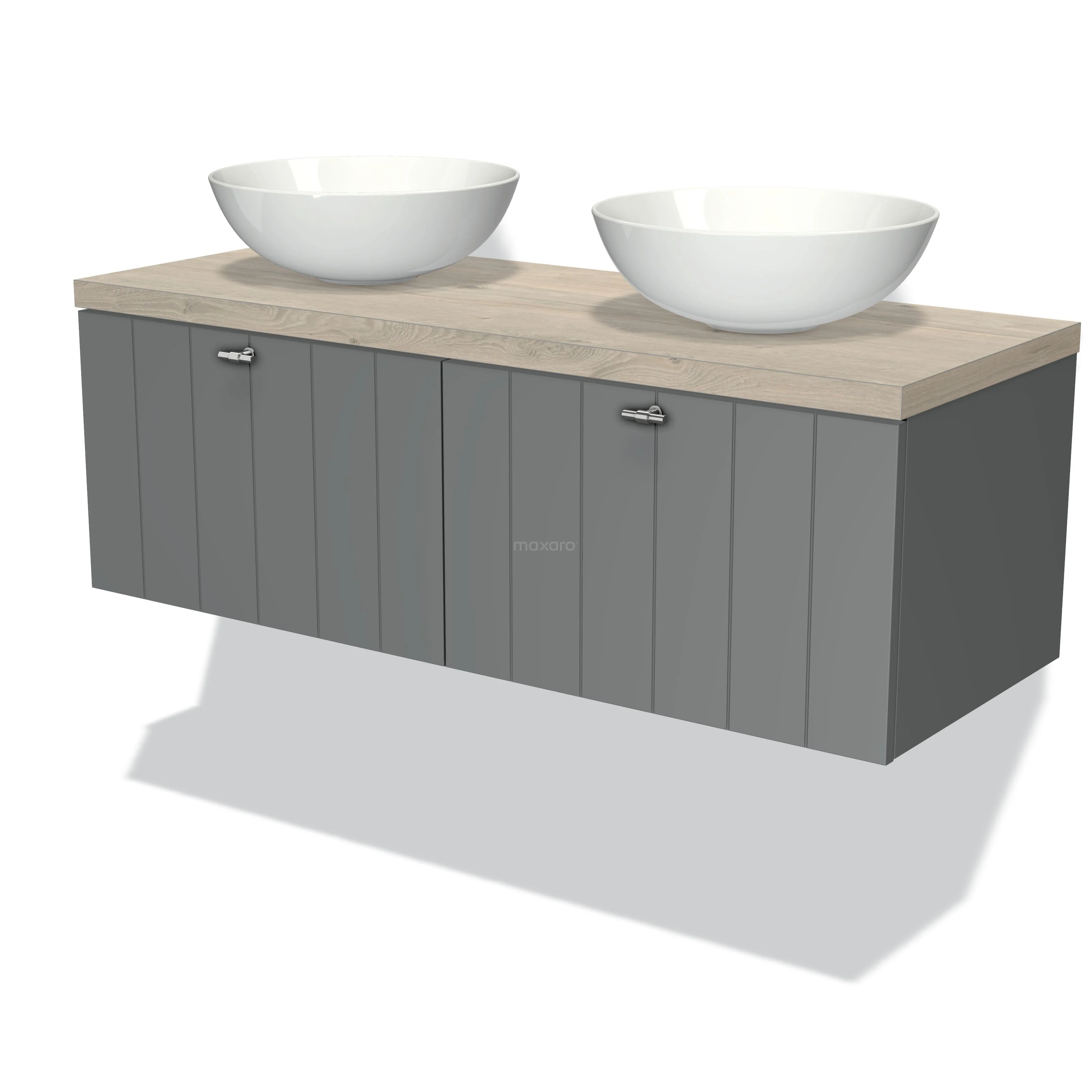 Modulo Plato Badmöbel mit Aufsatzwaschbecken | 120 cm Mittelgrau Lamelle front Hellgraue Eiche blatt 2 nebeneinanderliegende Schubladen