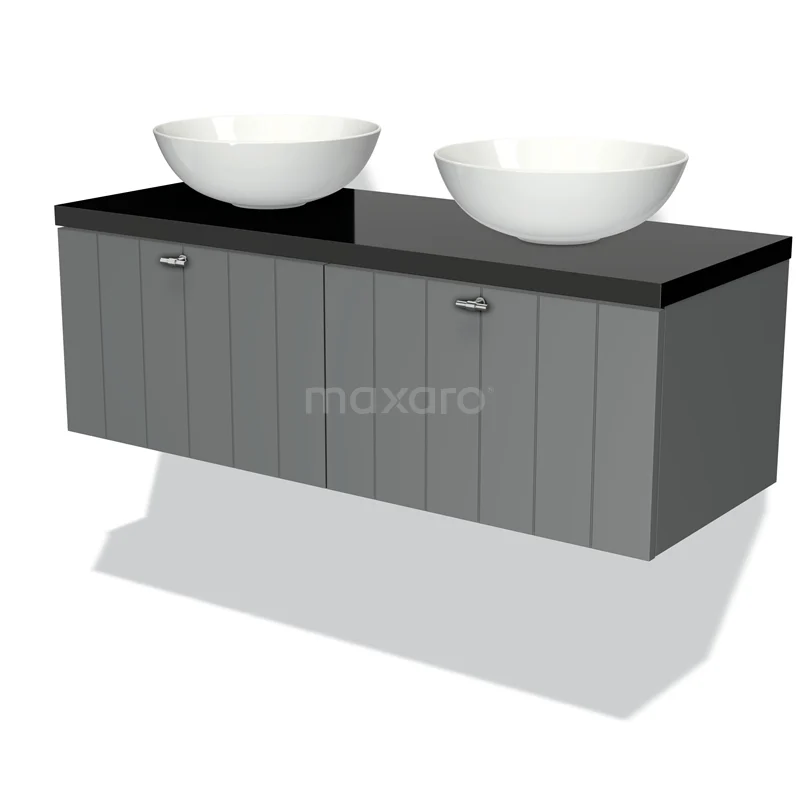 Modulo Plato Badmöbel mit Aufsatzwaschbecken | 120 cm Mittelgrau Lamelle front Hochglanz Schwarz blatt 2 nebeneinanderliegende Schubladen