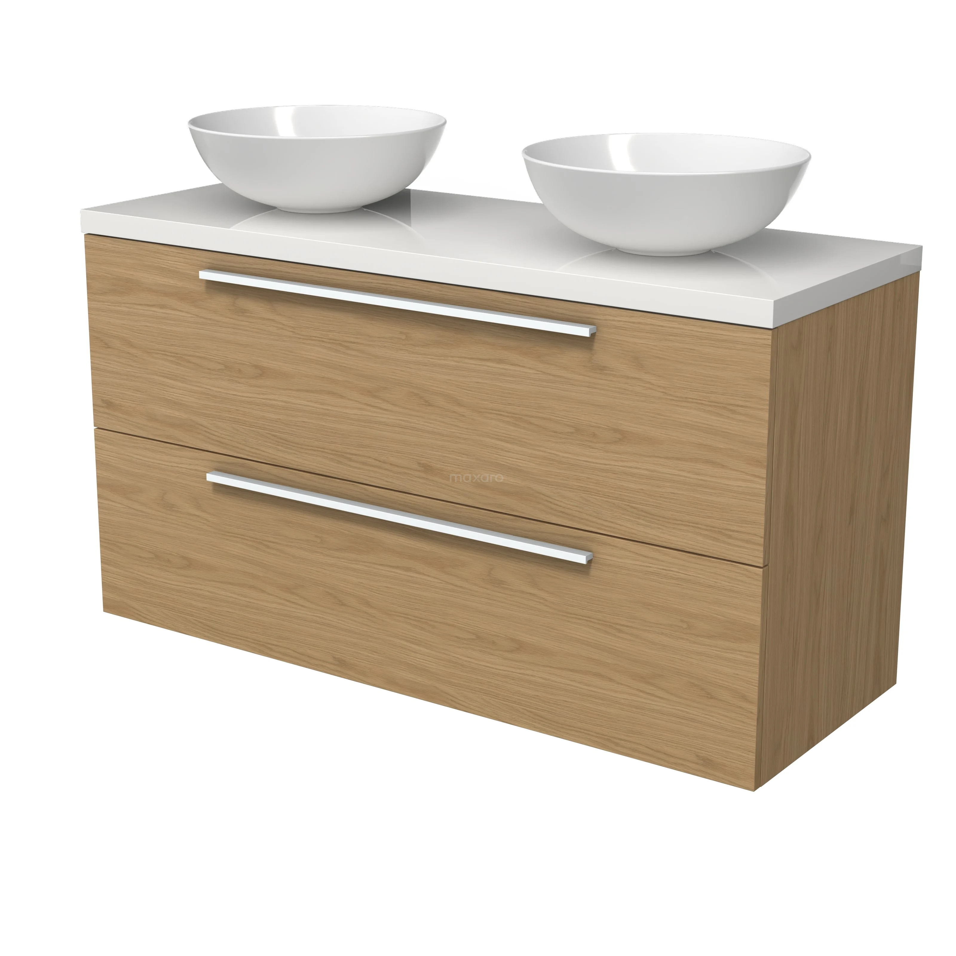Modulo Plato Badmöbel mit Aufsatzwaschbecken | 120 cm Natürliches Furnier Flach front Hochglanz Weiß blatt 2 übereinanderliegende Schubladen