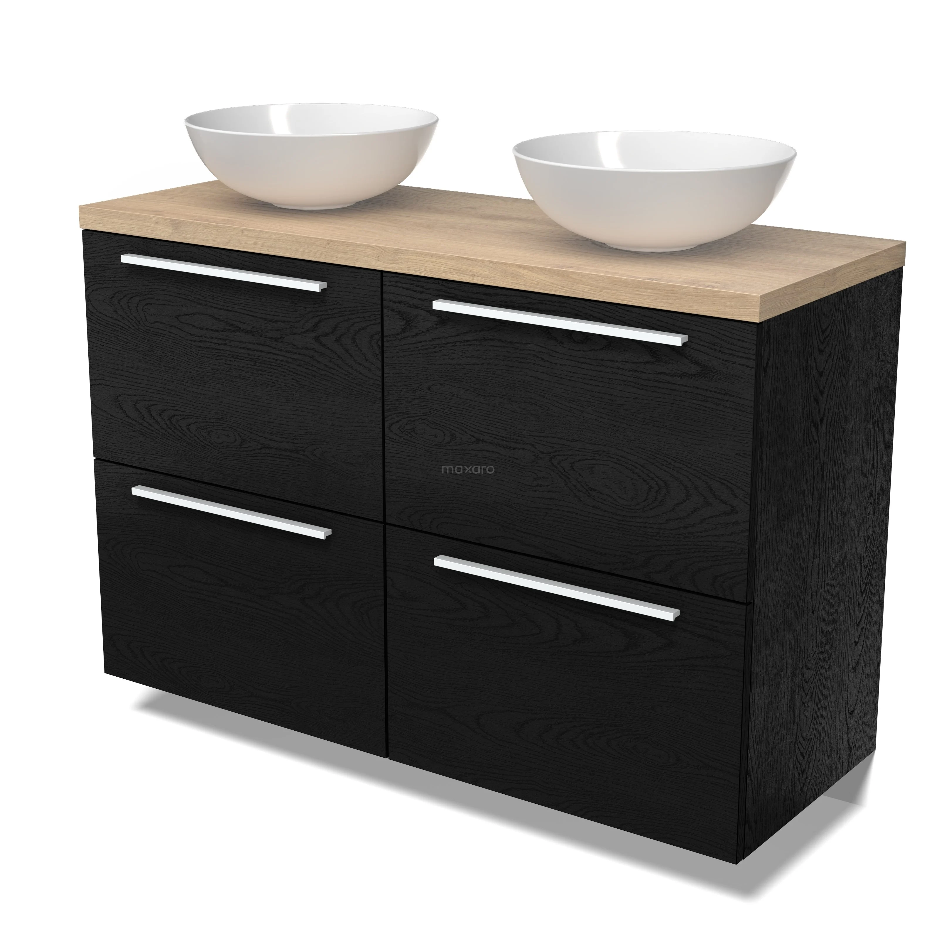 Modulo Plato Badmöbel mit Aufsatzwaschbecken | 120 cm Schwarze Eiche Flach front Hellbraune Eiche blatt 4 hohe Schubladen