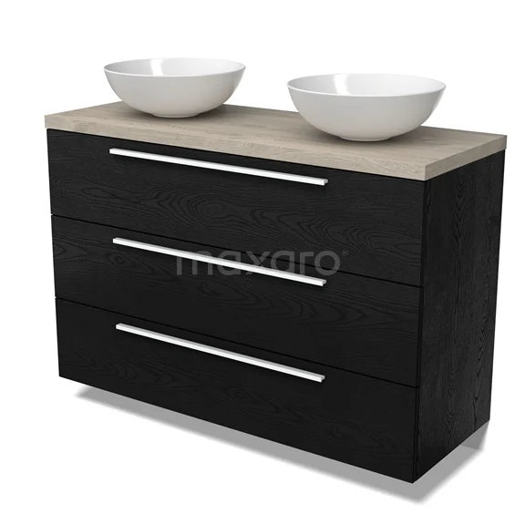 Modulo Plato Badmöbel mit Aufsatzwaschbecken | 120 cm Schwarze Eiche Flach front Hellgraue Eiche blatt 3 Schubladen