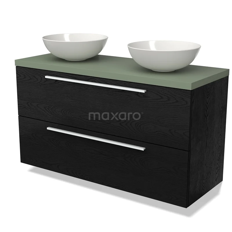 Modulo Plato Badmöbel mit Aufsatzwaschbecken | 120 cm Schwarze Eiche Flach front Salbeigrün blatt 2 übereinanderliegende Schubladen