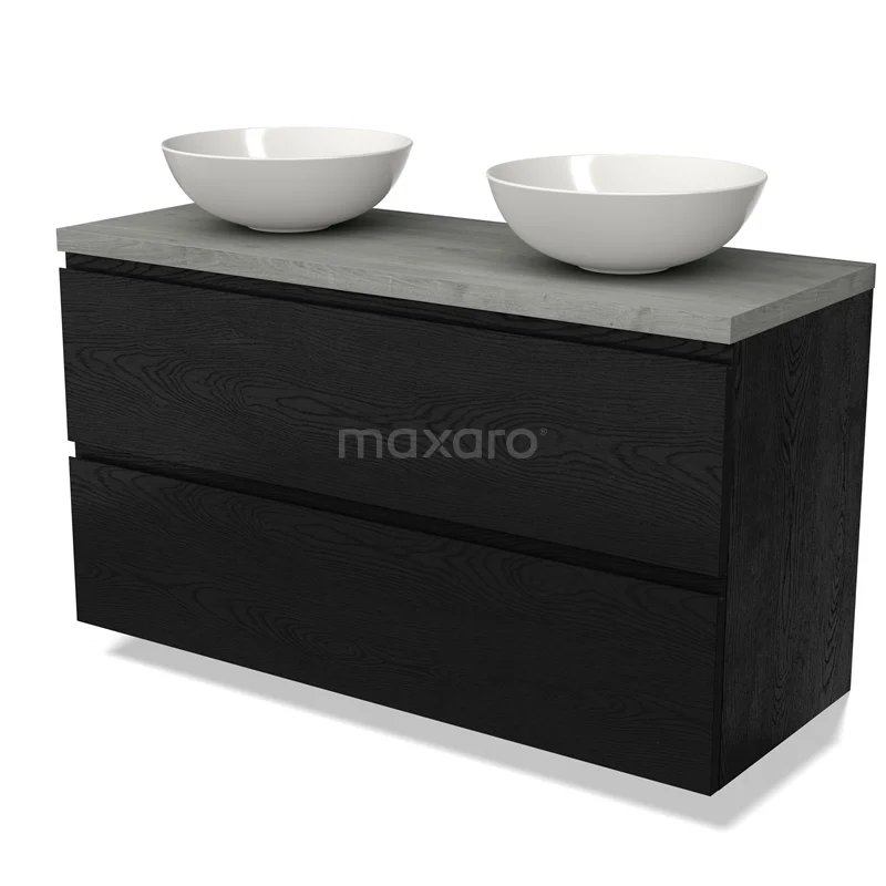 Modulo Plato Badmöbel mit Aufsatzwaschbecken | 120 cm Schwarze Eiche Grifflos front Graue Eiche blatt 2 übereinanderliegende Schubladen