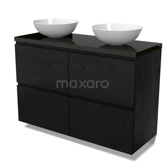 Modulo Plato Badmöbel mit Aufsatzwaschbecken | 120 cm Schwarze Eiche Grifflos front Hochglanz Schwarz blatt 4 hohe Schubladen