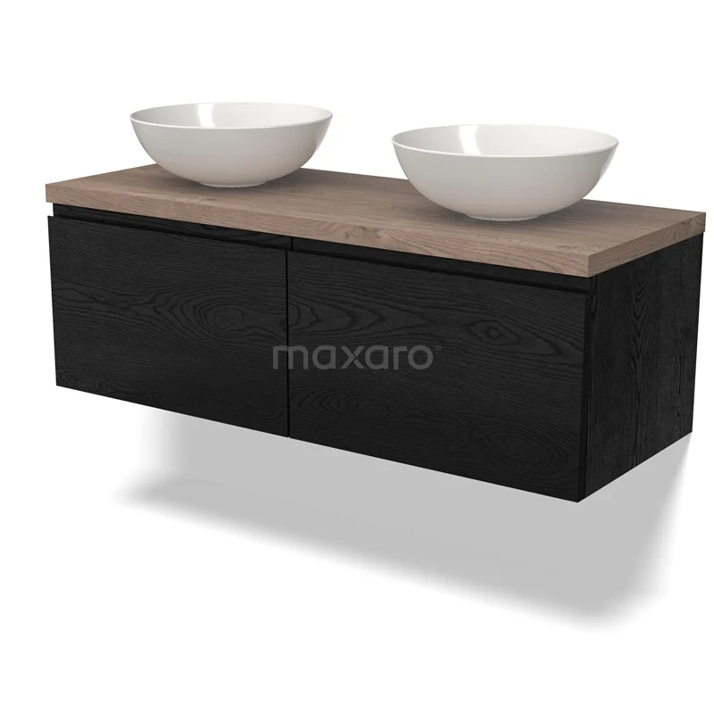 Modulo Plato Badmöbel mit Aufsatzwaschbecken | 120 cm Schwarze Eiche Grifflos front Mittelbraune Eiche blatt 2 nebeneinanderliegende Schubladen