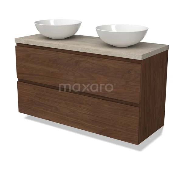 Modulo Plato Badmöbel mit Aufsatzwaschbecken | 120 cm Walnuss Grifflos front Hellgraue Eiche blatt 2 übereinanderliegende Schubladen